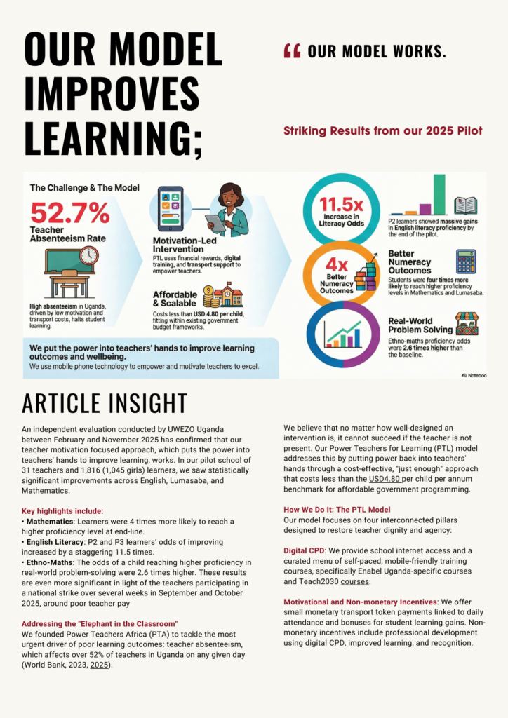 ARTICLE INSIGHT An independent evaluation conducted by UWEZO Uganda between February and November 2025 has confirmed that our teacher motivation focused approach, which puts the power into teachers’ hands to improve learning, works. In our pilot school of 31 teachers and 1,816 (1,045 girls) learners, we saw statistically significant improvements across English, Lumasaba, and […]