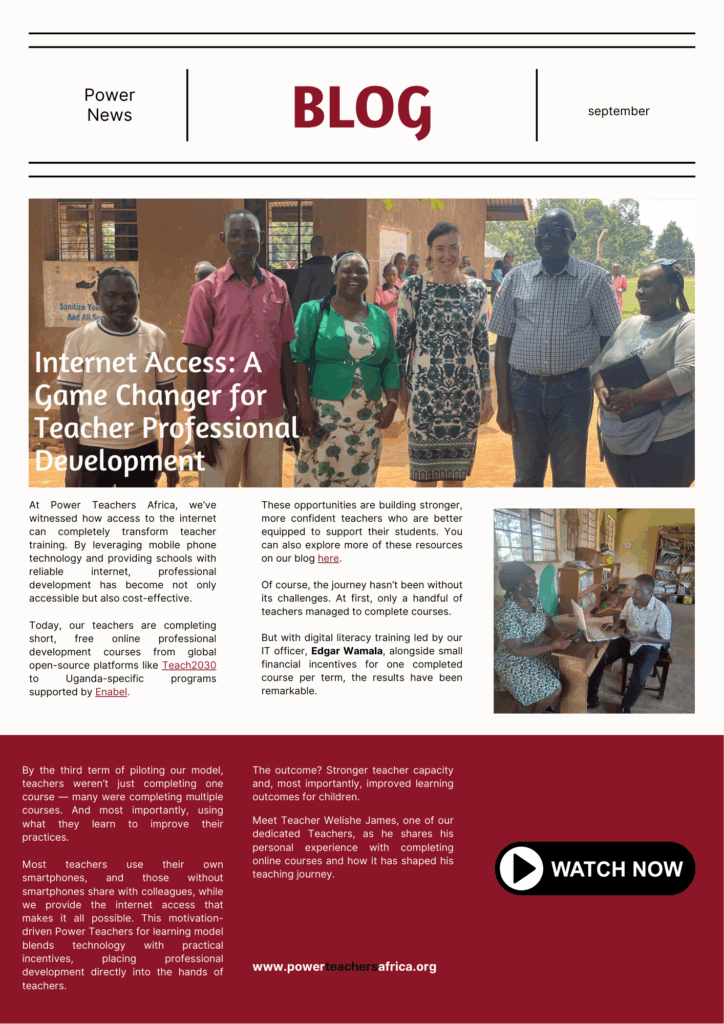 Internet Access: A Game Changer for Teacher Professional Development. At Power Teachers Africa, we’ve witnessed how access to the internet can completely transform teacher training. By leveraging mobile phone technology and providing schools with reliable internet, professional development has become not only accessible but also cost-effective. Today, our teachers are completing short, free online professional […]