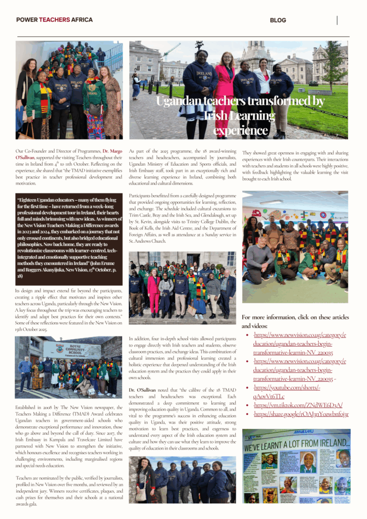 Our Co-Founder and Director of Programmes, Dr. Margo O’Sullivan, supported the visiting Teachers throughout their time in Ireland from 4 to 11th October. Reflecting on the experience, she shared that “the TMAD initiative exemplifies best practice in teacher professional development and motivation. “Eighteen Ugandan educators – many of them flying for the first time – […]