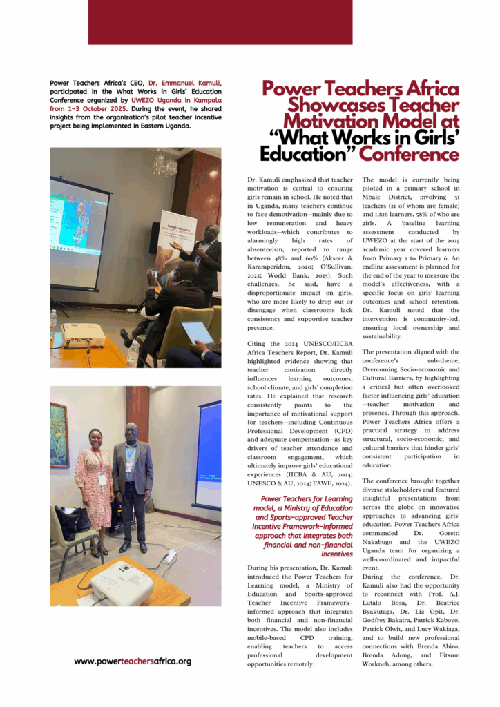 Power Teachers Africa’s CEO, Dr. Emmanuel Kamuli, participated in the What Works in Girls’ Education Conference organized by UWEZO Uganda in Kampala from 1–3 October 2025. During the event, he shared insights from the organization’s pilot teacher incentive project being implemented in Eastern Uganda. Dr. Kamuli emphasized that teacher motivation is central to ensuring girls […]